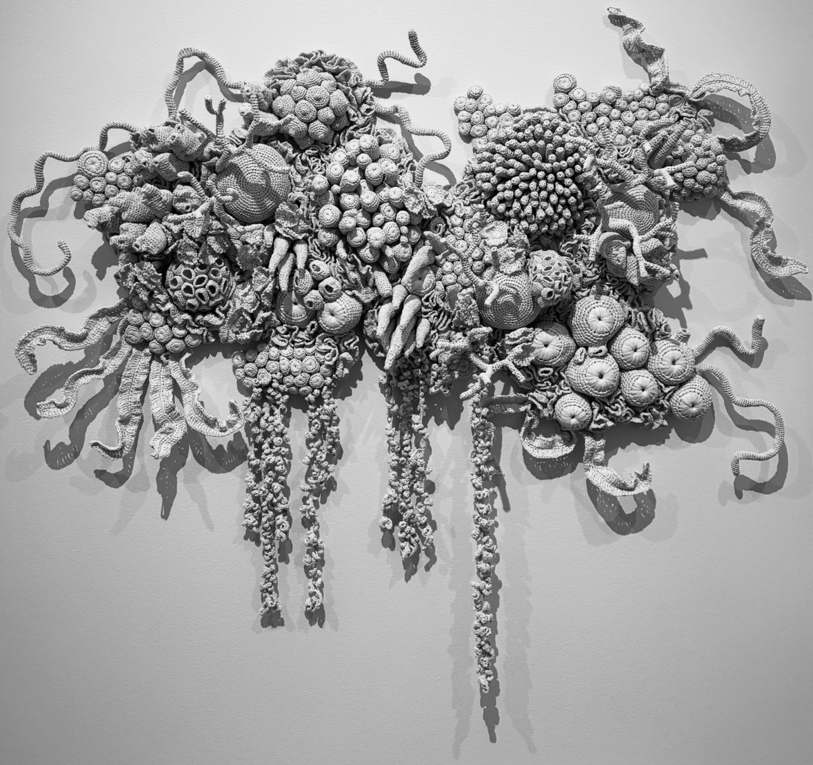 We visited the Mulyana exhibit opening at the IU art museum. Mulyana is an Indonesian contemporary artist renowned for his large-scale knit and crochet installations. This exhibit focused on the health of underwater ecosystems, coral, and coral bleaching. I was particularly taken by a wall-sized piece of beautifully intricate crochet'd coral made from white plastic bags. The effect was an incredibly realistic bleached coral with a wonderful desaturated effect that really tickled my appreciation for light/shadow play.